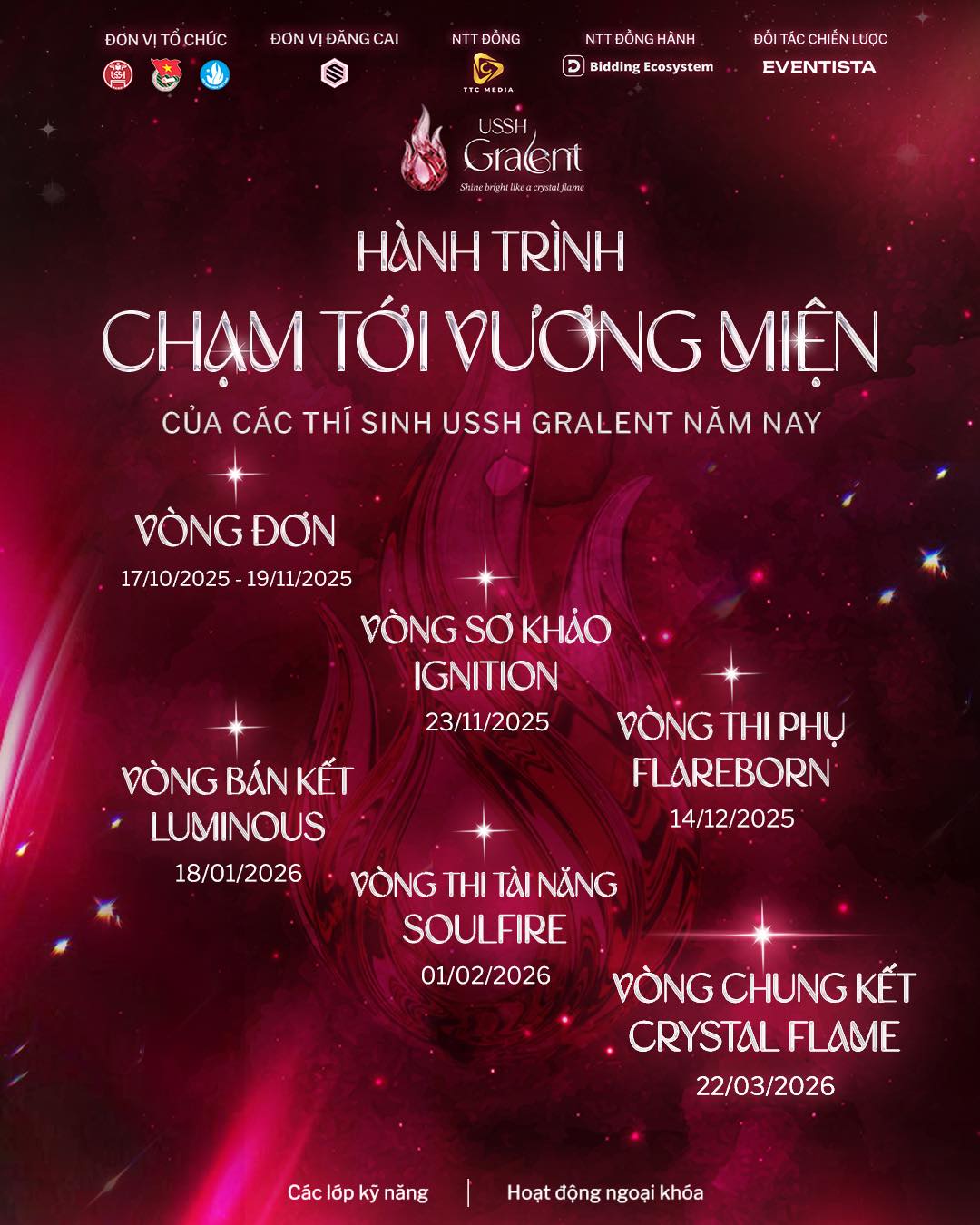 - HỌP BÁO & TALKSHOW “SHINE OR STAY” - Lễ công bố khởi động chương trình (17/10/2025): Công bố chính thức thông tin về cuộc thi USSH Gralent đến toàn thể sinh viên, truyền thông cũng như các đơn vị liên quan và tổ chức Talkshow “Shine or stay”.